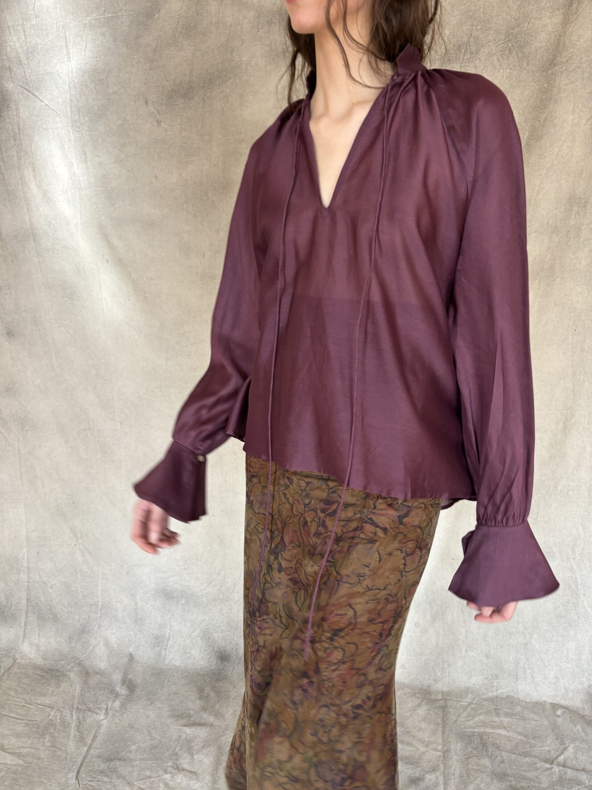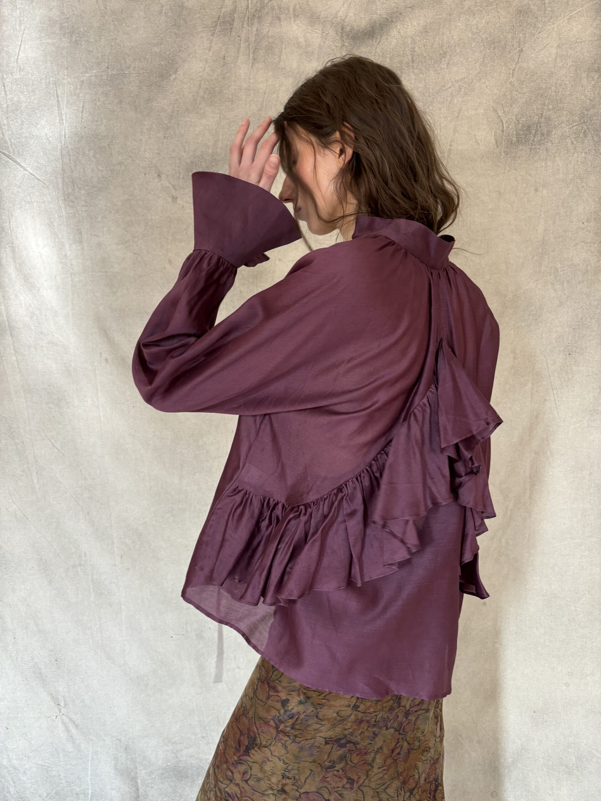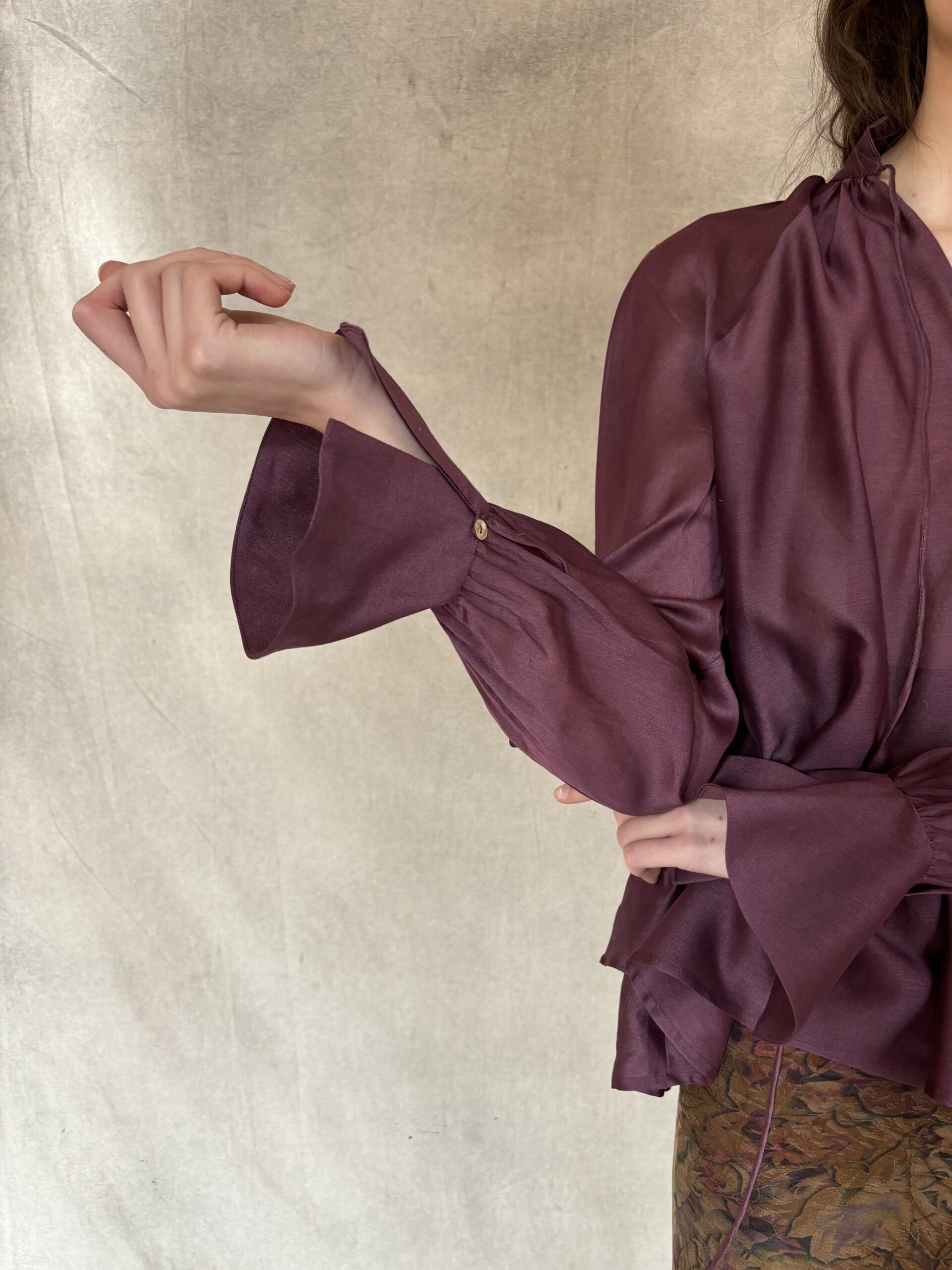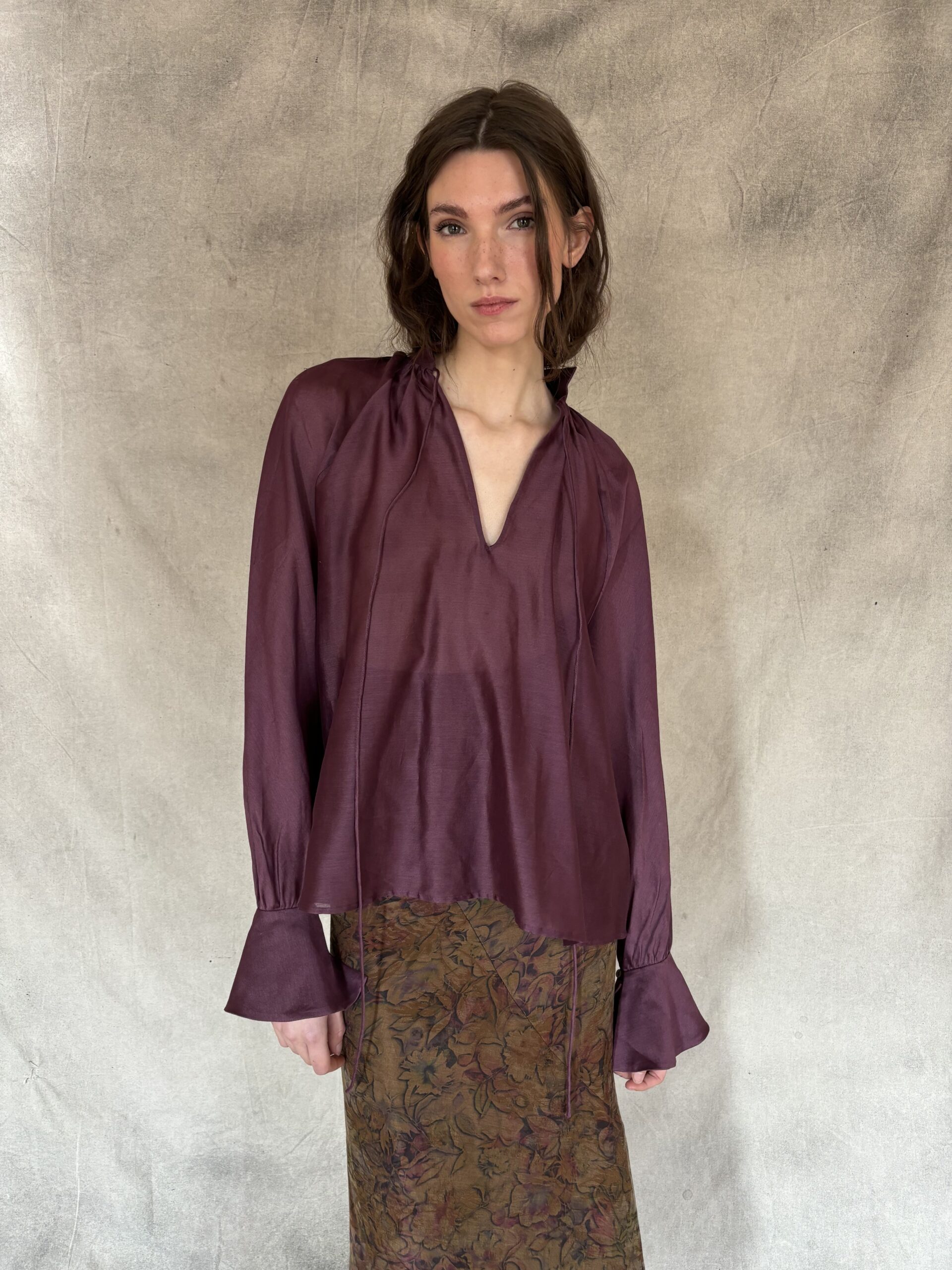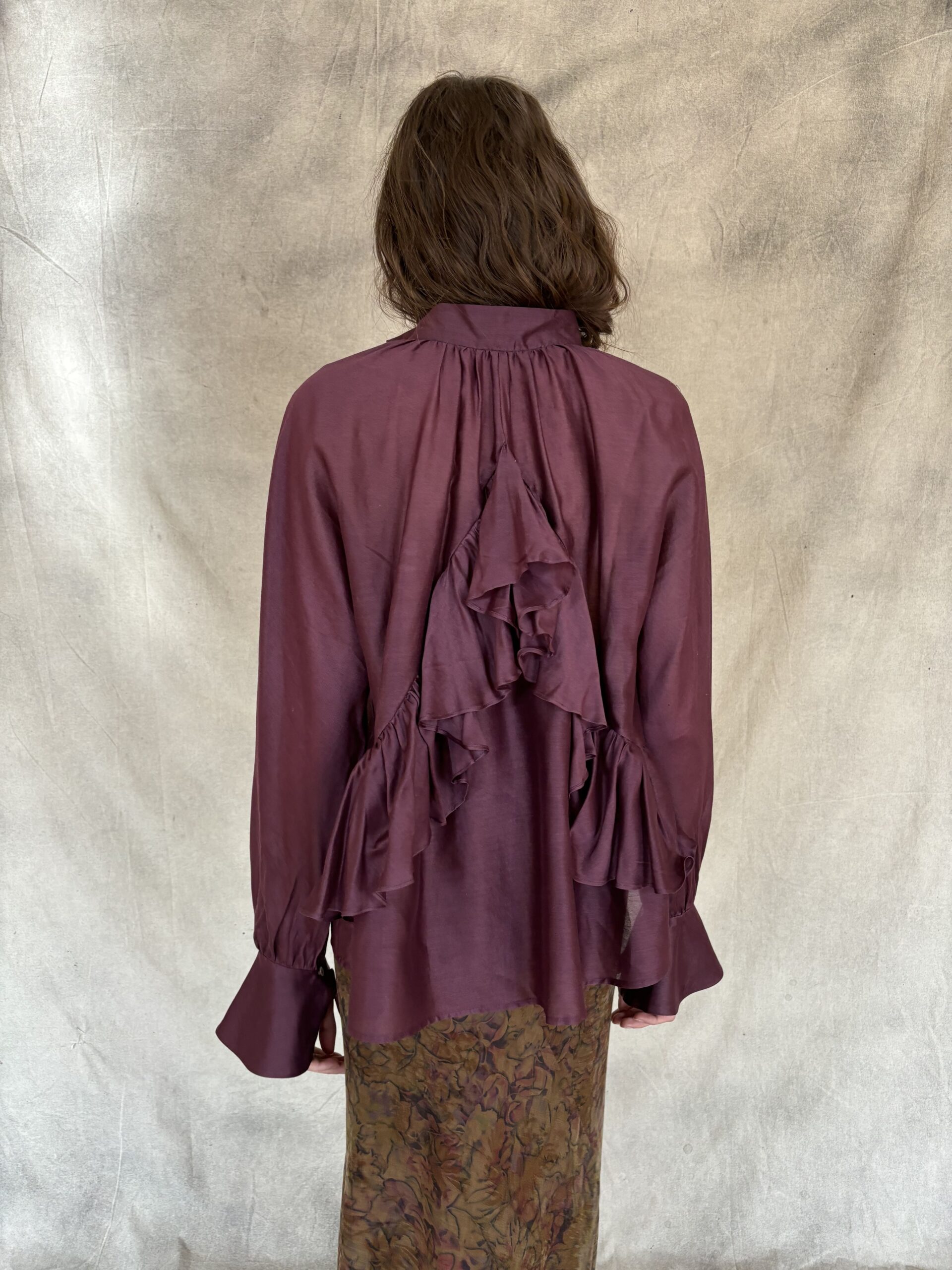 La Camisa Pulso es una pieza de sastrería contemporánea confeccionada en organza de algodón color vino. Su cuello mao y la abertura en pico estilizan la silueta, mientras que la espalda en volante aporta un movimiento arquitectónico que transforma cada gesto en un detalle de diseño. Los puños anchos, cuidadosamente acabados, refuerzan la estructura de la manga larga y equilibran la ligereza del tejido.