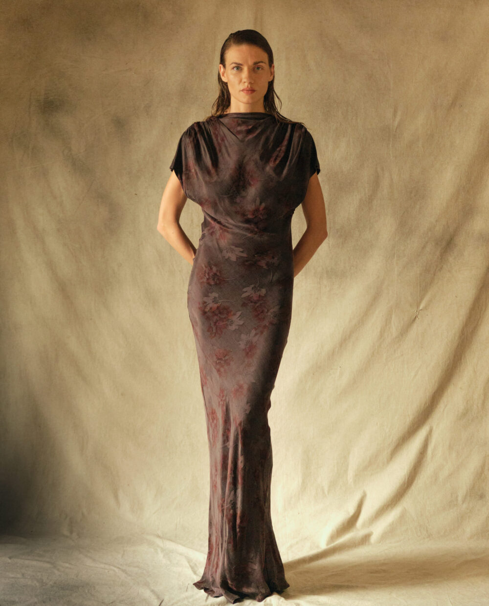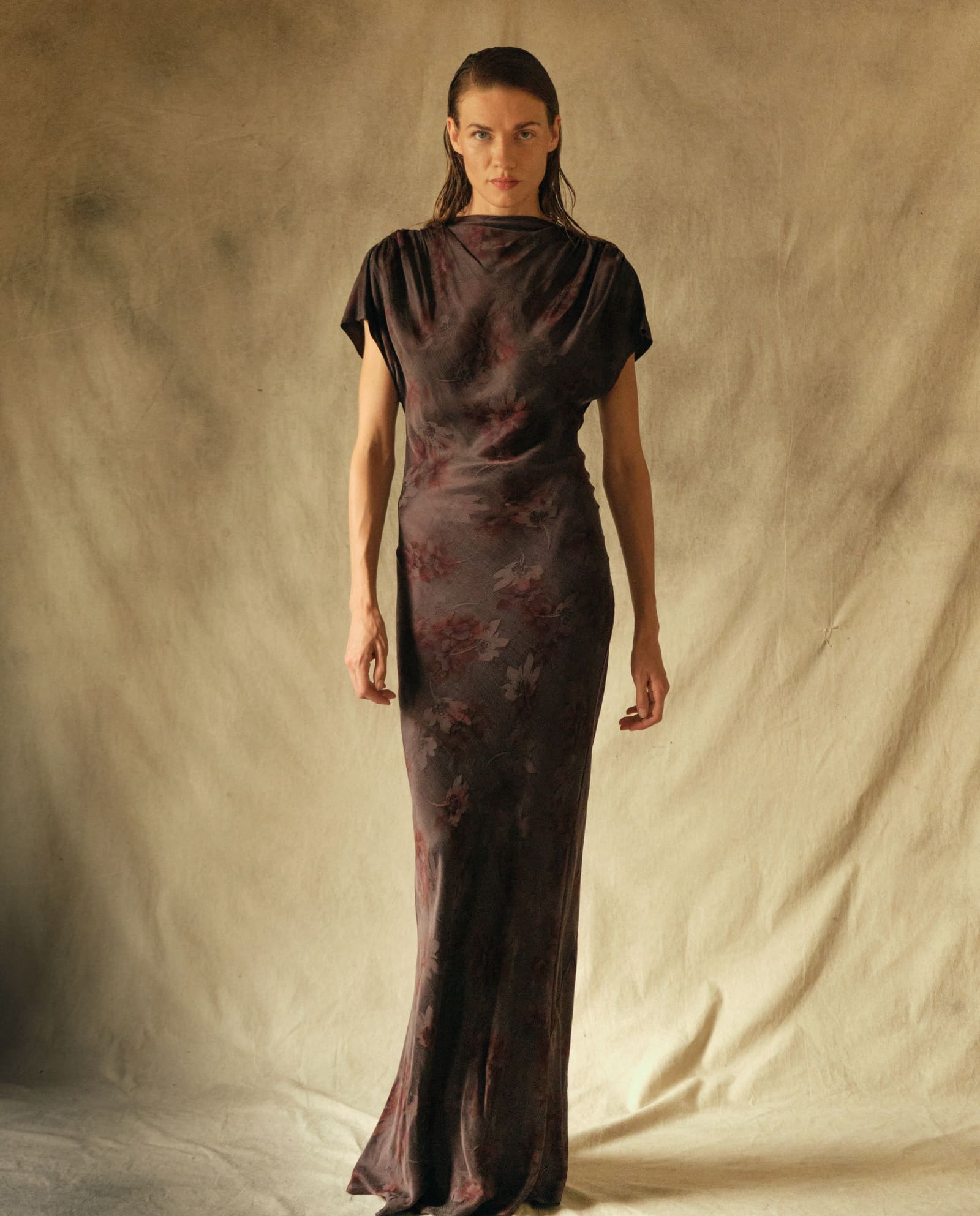 Vestido confeccionado en cupro de viscosa con estampado de flores color teja y berenjena. Corte al bies. Detalle de frunce en los hombros. Espalda al aire. Color gris #686663, color teja #a53f0f color berenjena #602d59